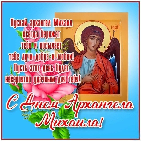 Поздравляю с Днем святого Михаила! Желаю крепкой и неотступной молитвенной защиты Святого Архистратига Михаила для Вас и Вашего дома! Пусть сердце будет спокойным, пусть душа будет чистой, мысли ясными, добрые дела искренними, а жизненные ситуации легко преодолимыми! Будьте счастливы, здоровы и любимы Богом!